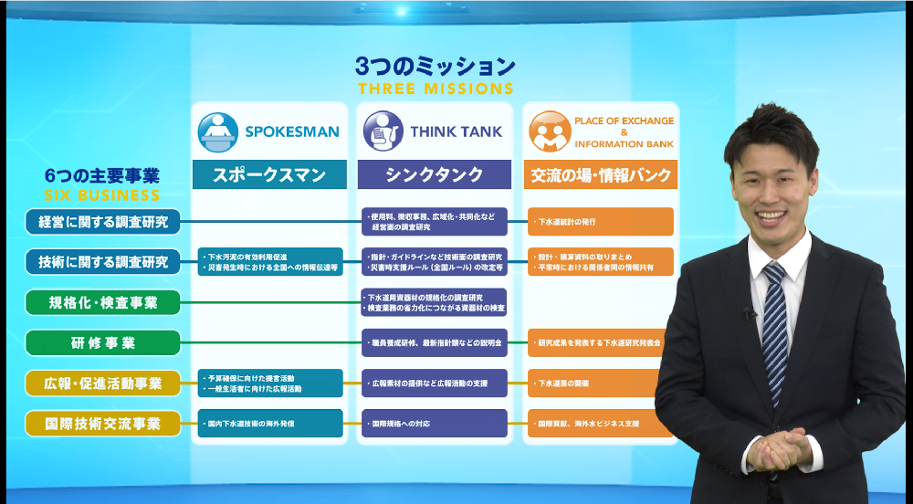 協会様活動紹介VTR作成 ホームイベント事例 協会様活動紹介VTR作成 公益社団法人 日本下水道協会 様 協会様活動紹介VTR作成 DATE 2020年5月 CATEGORY その他イベント事例 PLACE 弊社内 会議室 イベント概要 活動紹介VTR制作 提供施策・イベント演出 (2021年3月制作時) 弊社会議室をクロマキー撮影スタジオ仕様にし、撮影を行いました。企画、構成、演出、出演者アレンジをプロデュース事業部が担当。テクニカルディレクション、CG制作、撮影、編集をEC事業部が担当いたしました。 全てのイベント事例一覧へ戻る